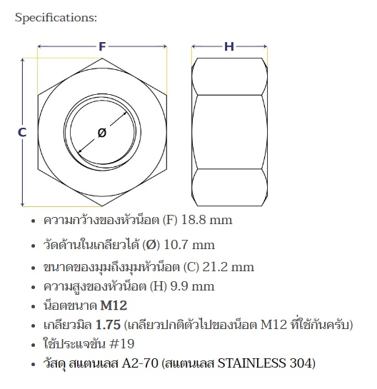 หัวน็อตสแตนเลส เบอร์ M12x1.75 วัสดุ สแตนเลส A2-70 (สแตนเลส STAINLESS 304)